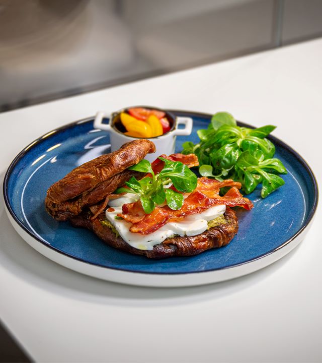 Croissant, slanina neúdená 80 g, Mozzarella 125 g, sezónny šalát, maslo 7 g, bazalkové pesto 25 g